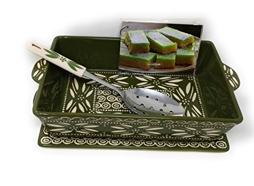 Temp-tations Baker Carved Old World 2.5 Qt 11"x7" Casserole Dish w/ Tray, Server & Recipe Cards (Old World Green).